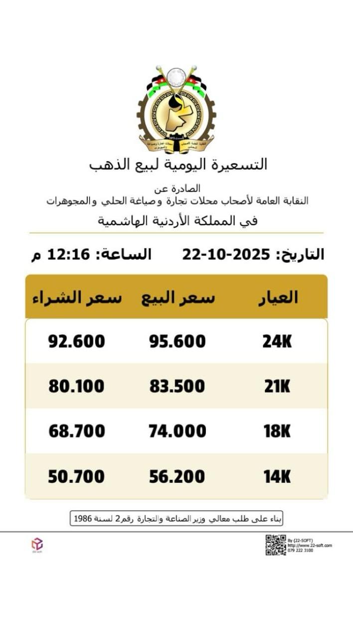 وبحسب النشرة الصباحية الصادرة عن النقابة العامة لأصحاب محلات تجارة وصياغة الحلي والمجوهرات، فقد بلغ سعر الغرام الواحد من الذهب عيارات 24 و18 و14 لغايات البيع في محلات الصاغة 95.6 و74 و56.2 دينارًا على التوالي.