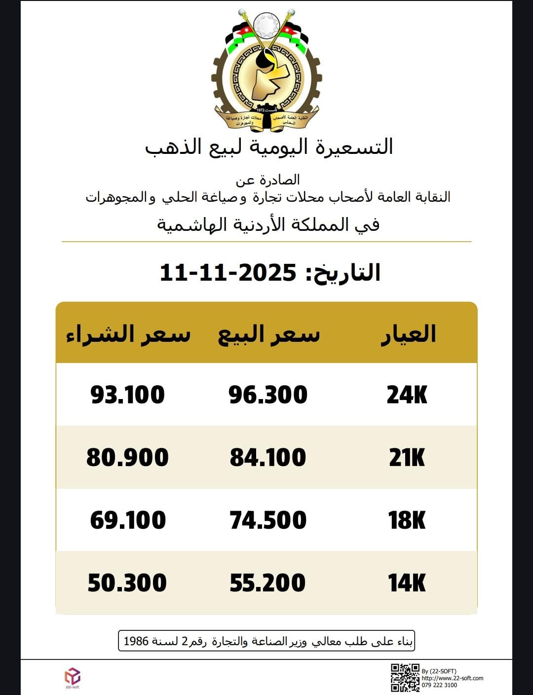 ووفق النشرة الصباحية الصادرة عن النقابة العامة لأصحاب محلات تجارة وصياغة الحلي والمجوهرات، سجل سعر الغرام الواحد من الذهب عيارات 24 و18 و14 لغايات البيع في محلات الصاغة 96.30 و74.50 و55.20 دينارًا على التوالي.